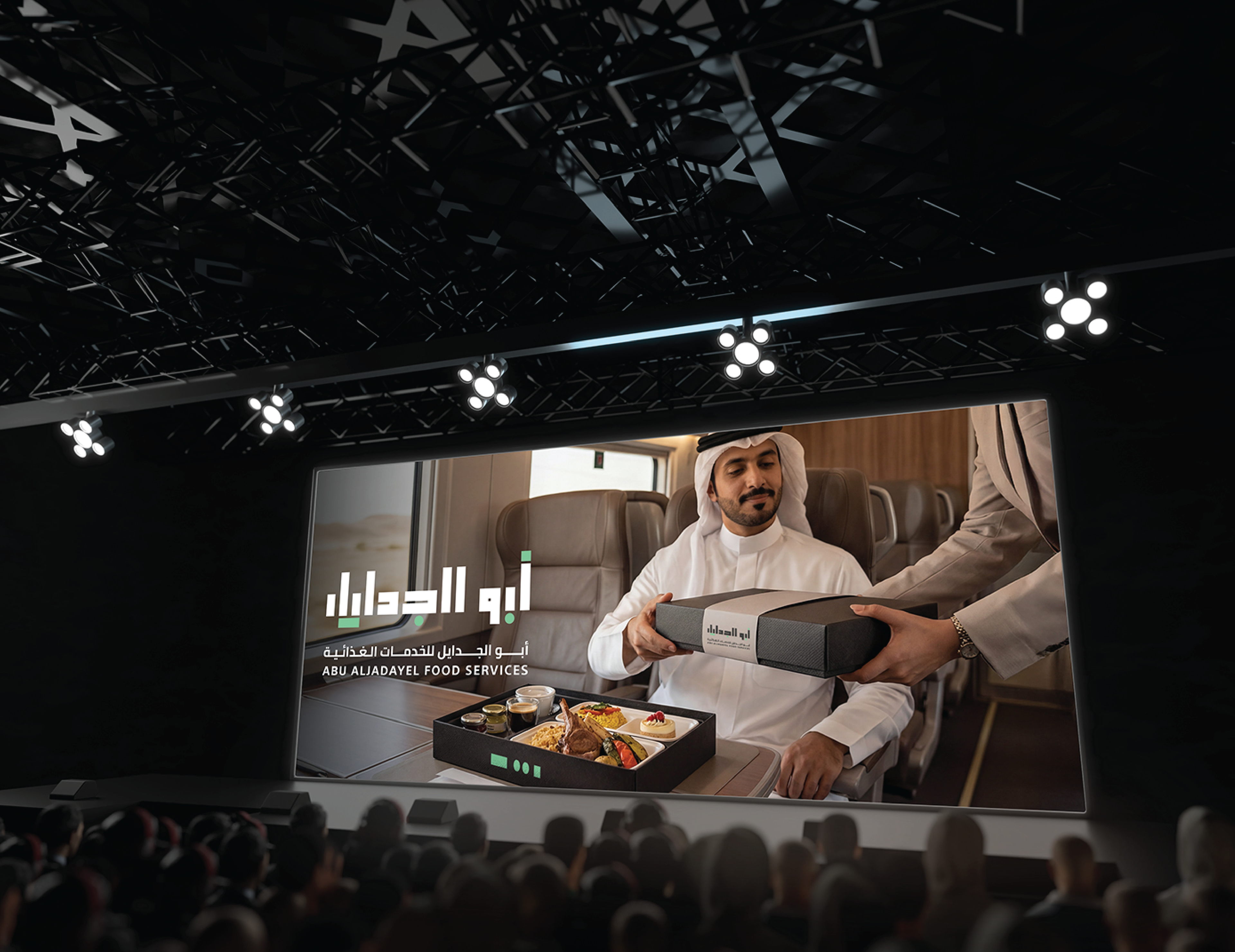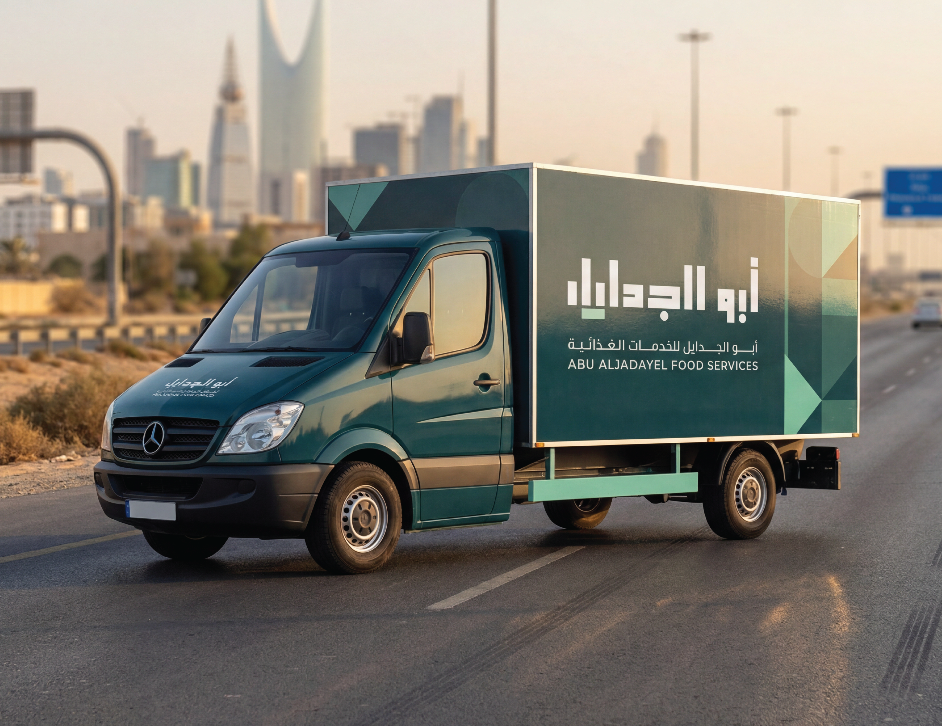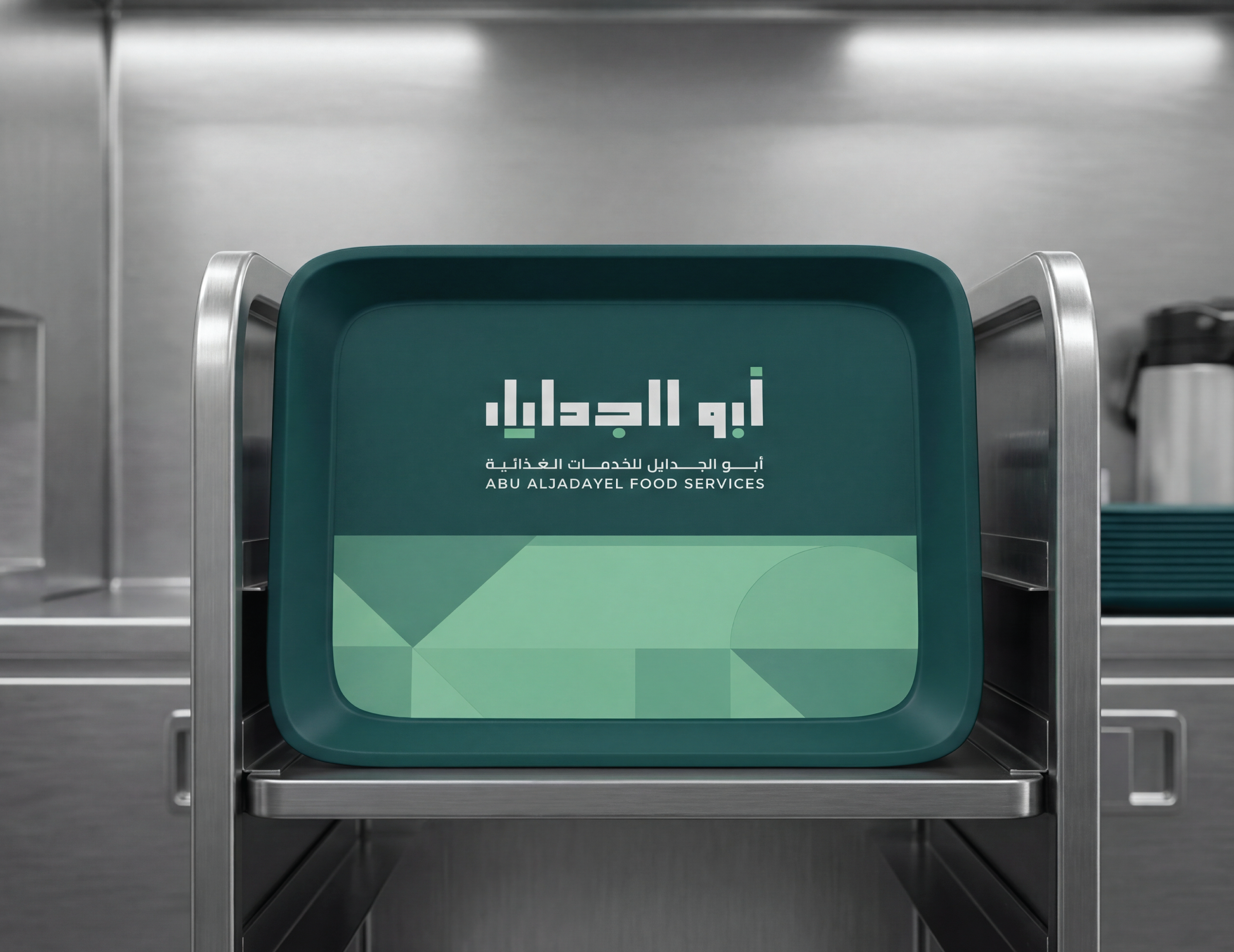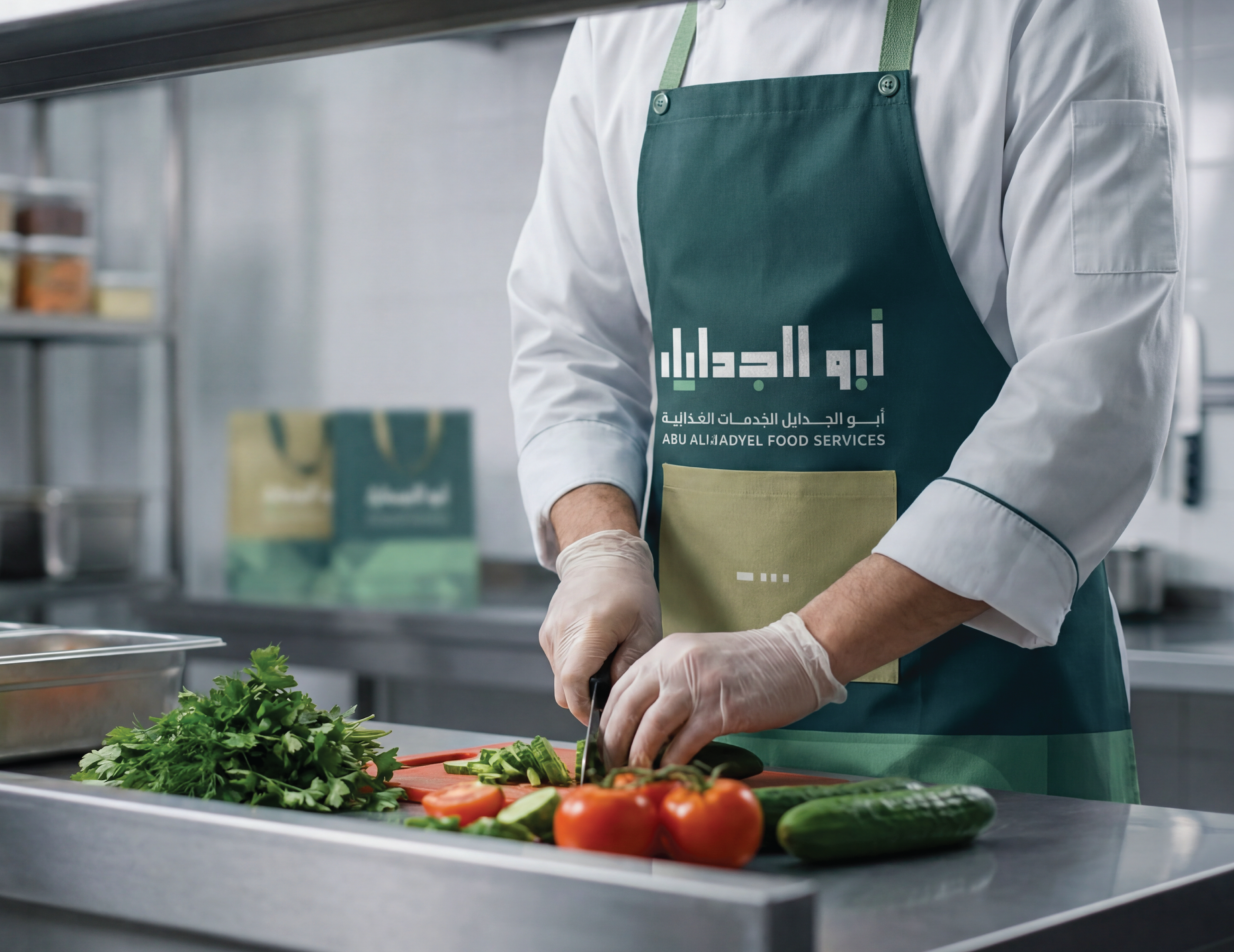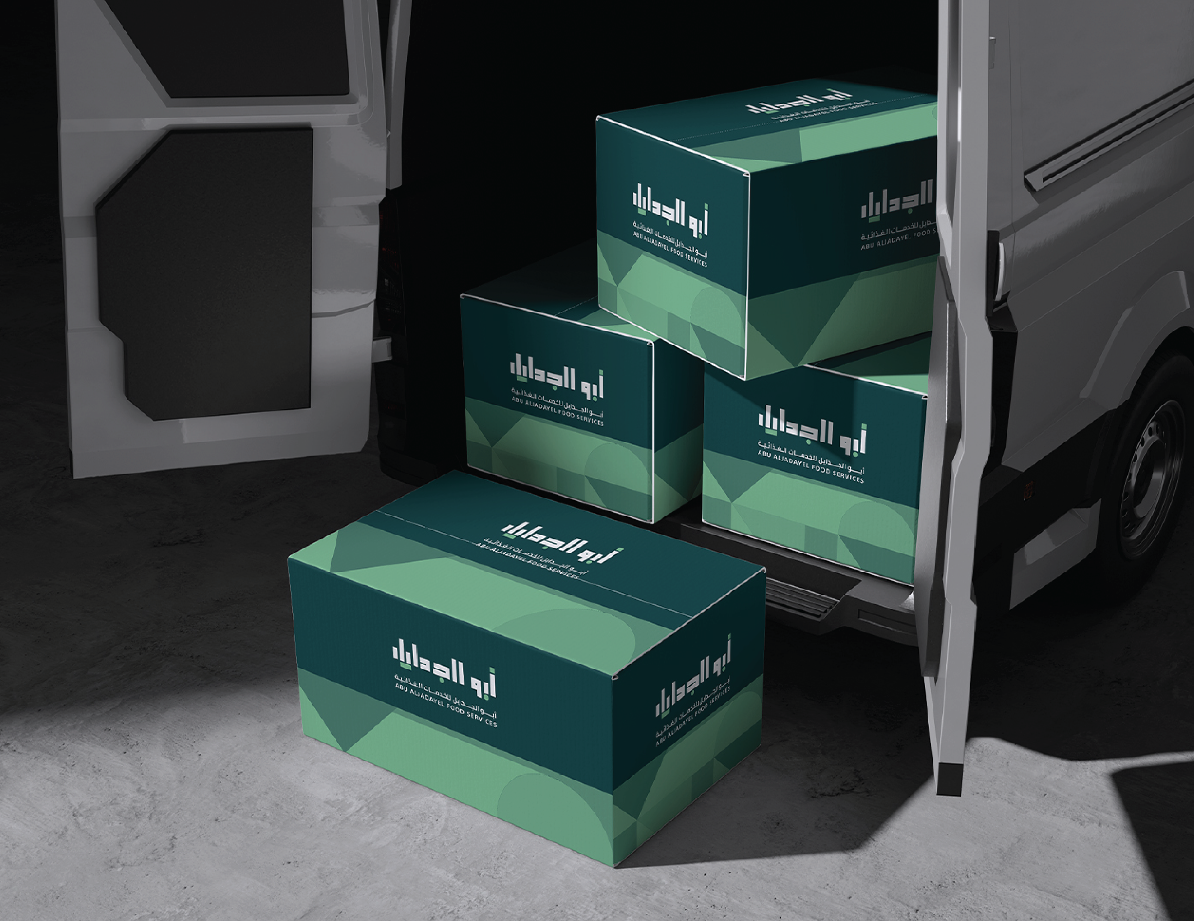Abu AlJadayel Food Services brand identity system designed for premium large-scale catering operations. The project includes logo system, color palette, typography, geometric pattern language, and a full set of brand applications across stationery, uniforms, packaging, wayfinding, vehicle signage, and social media templates.
