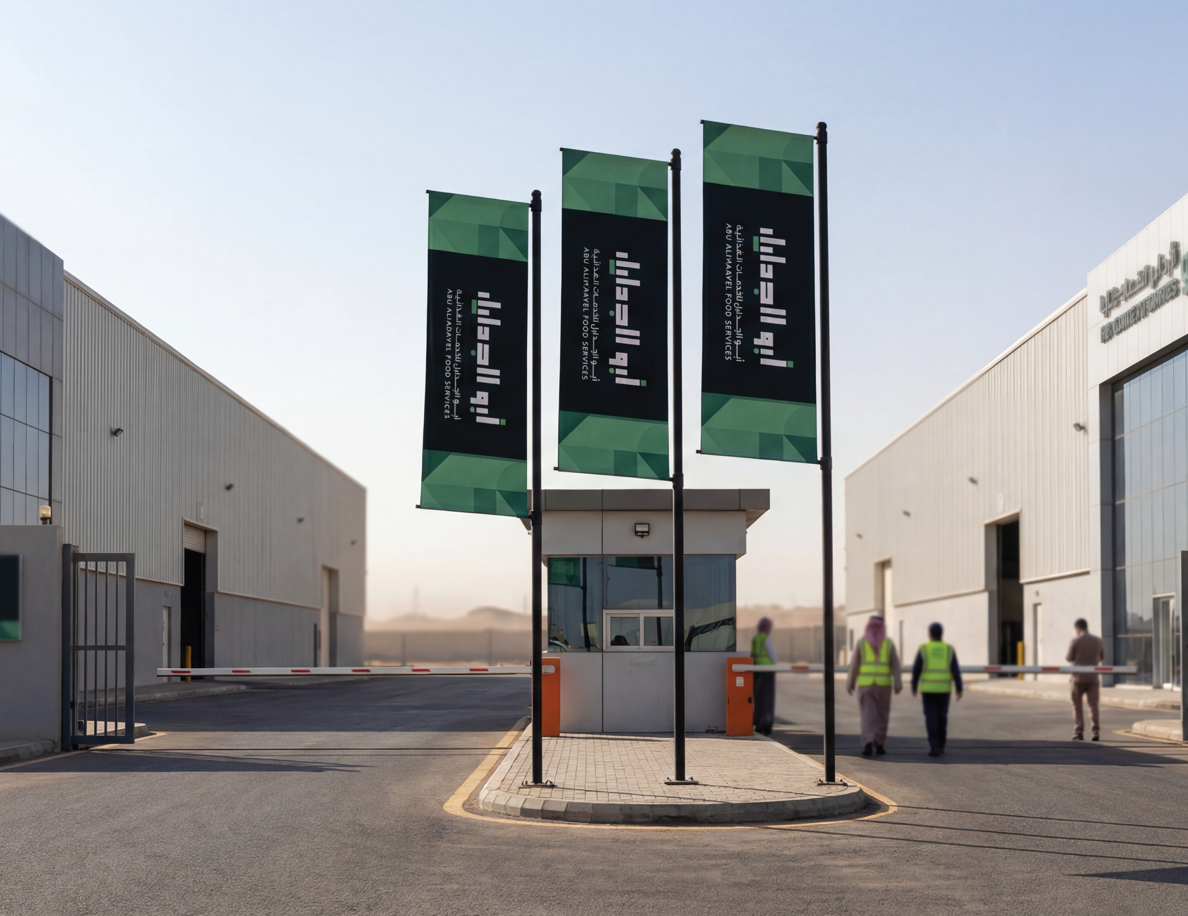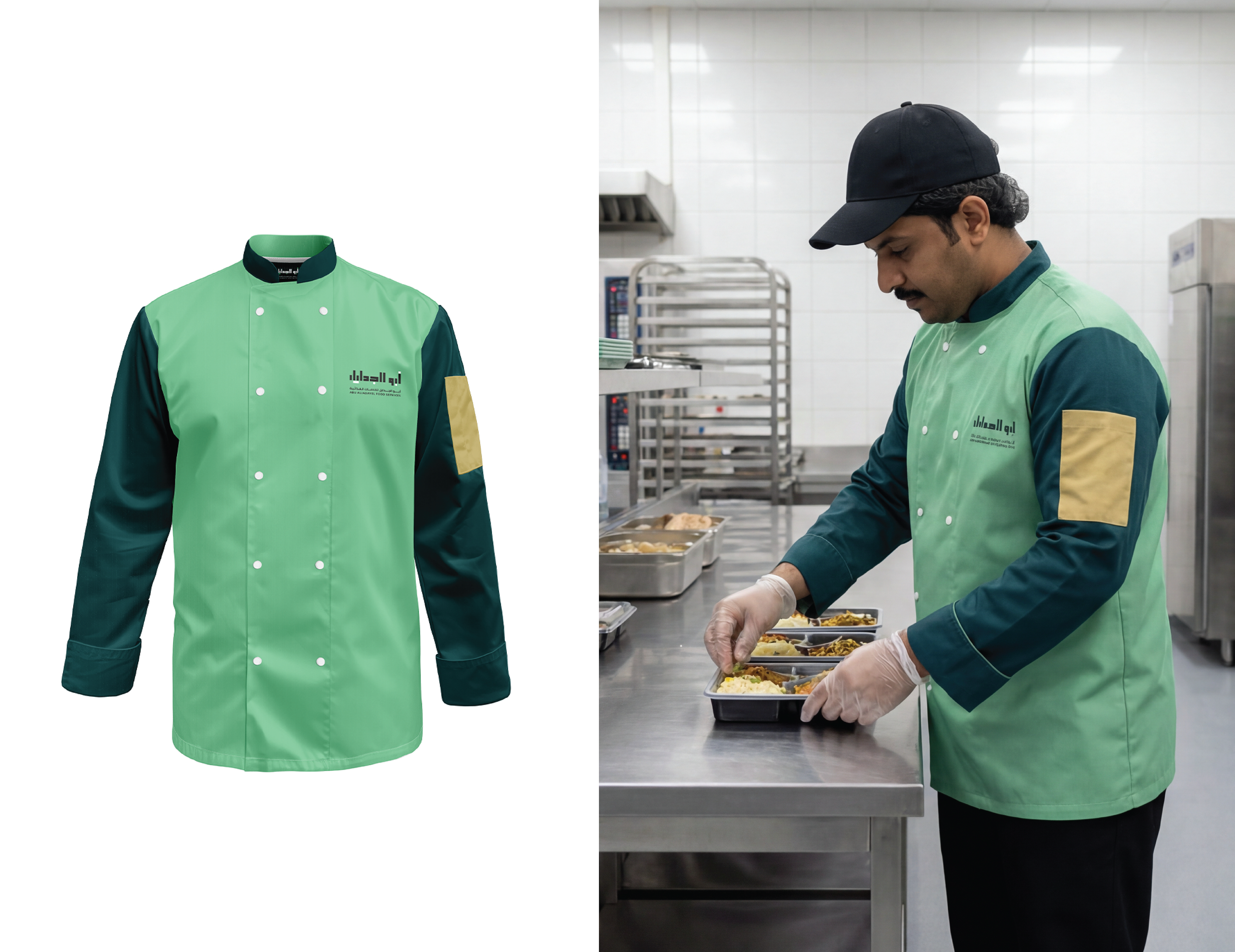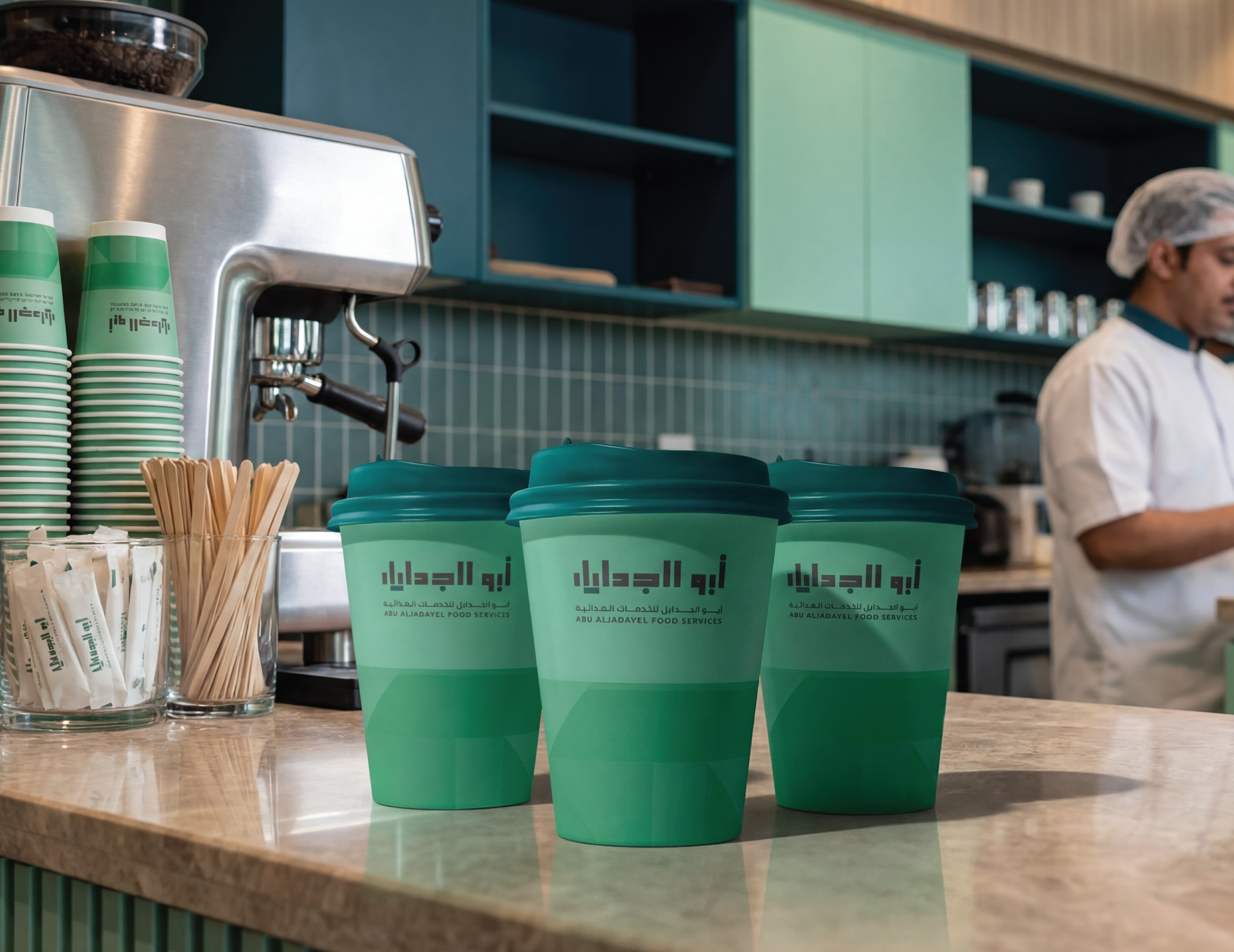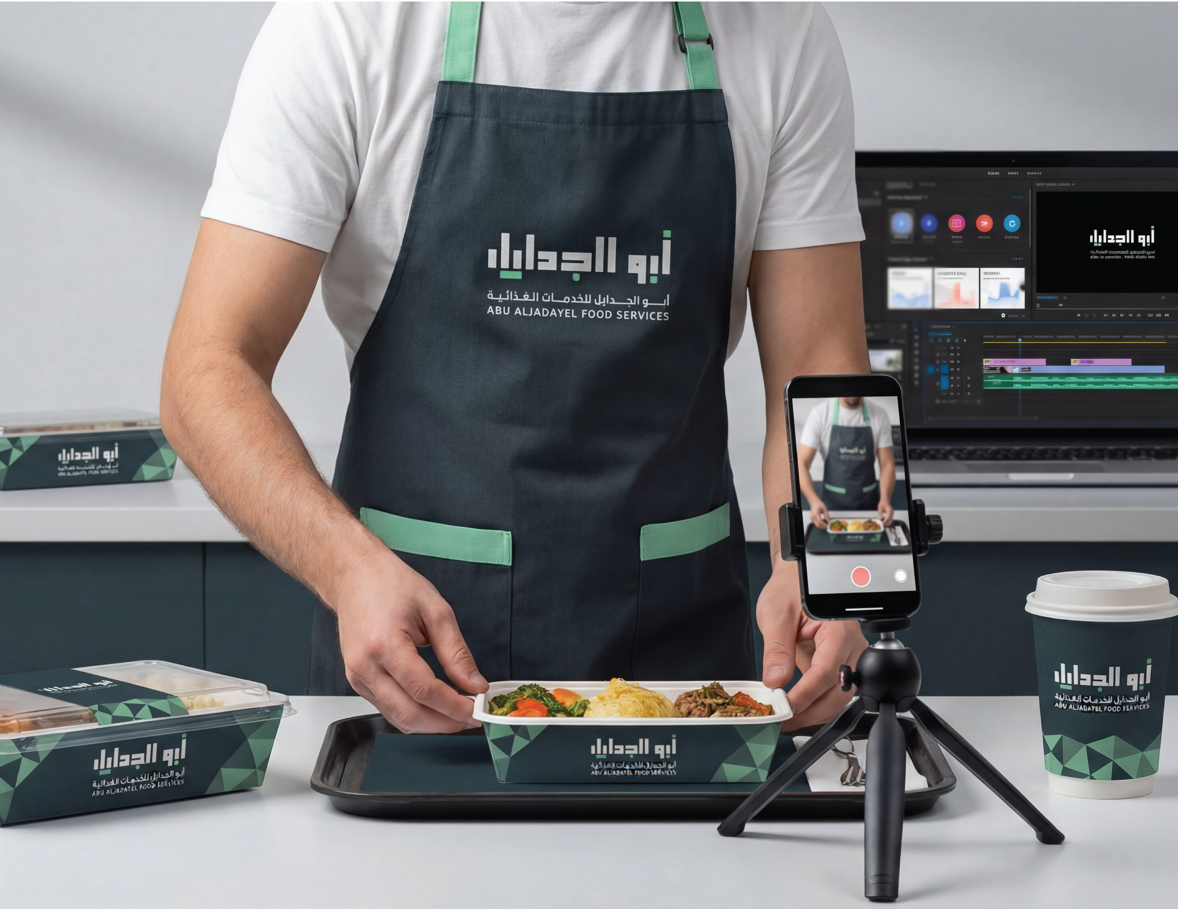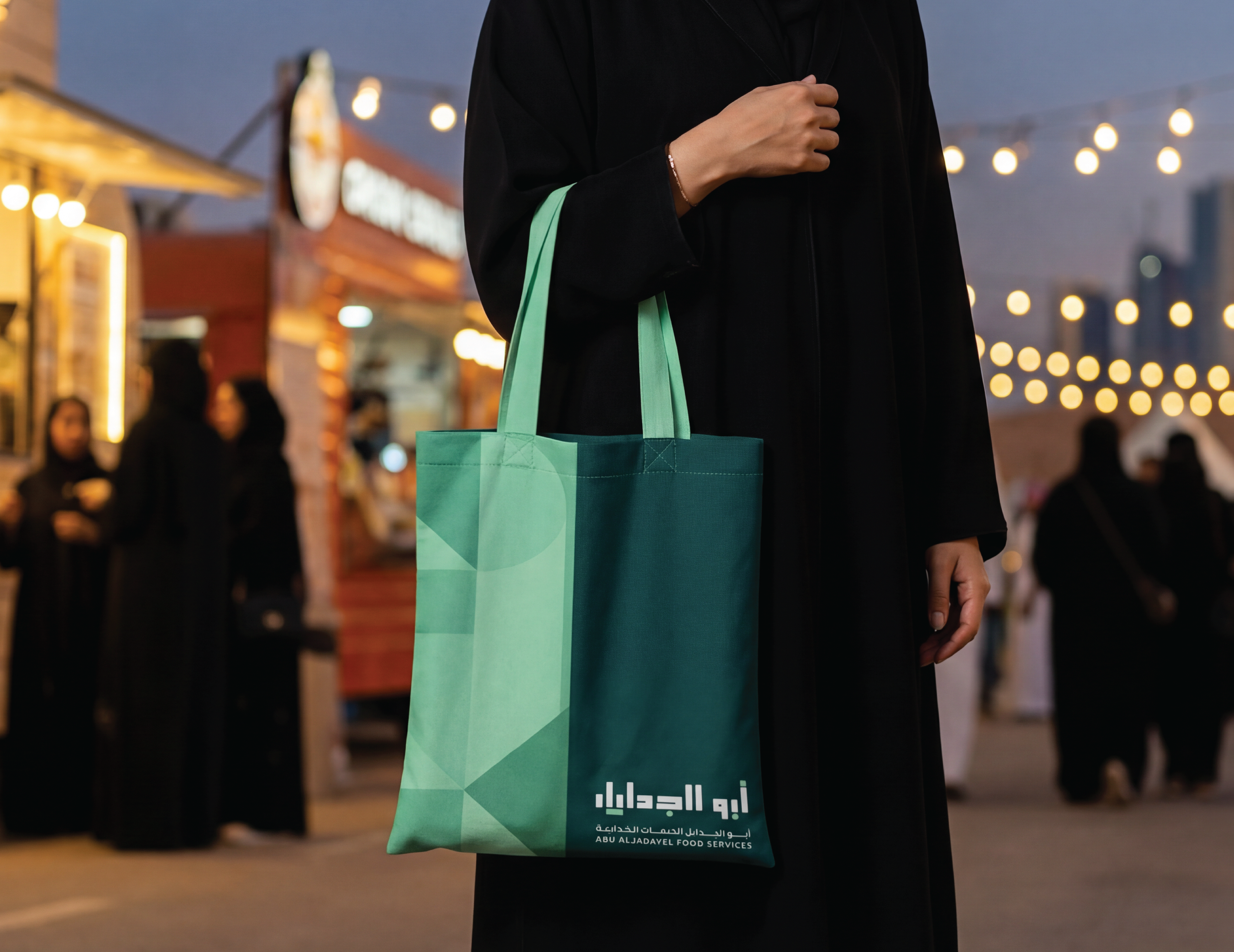 Abu AlJadayel Food Services brand identity system designed for premium large-scale catering operations. The project includes logo system, color palette, typography, geometric pattern language, and a full set of brand applications across stationery, uniforms, packaging, wayfinding, vehicle signage, and social media templates.