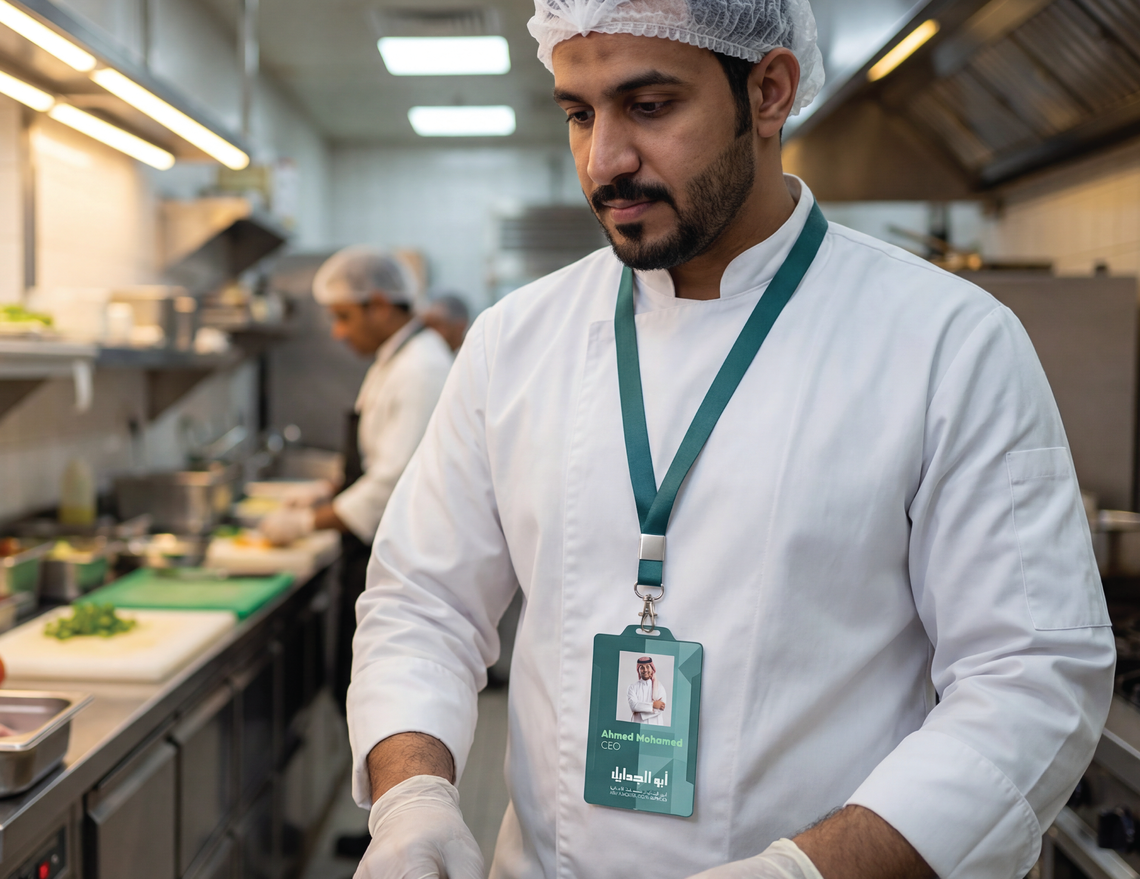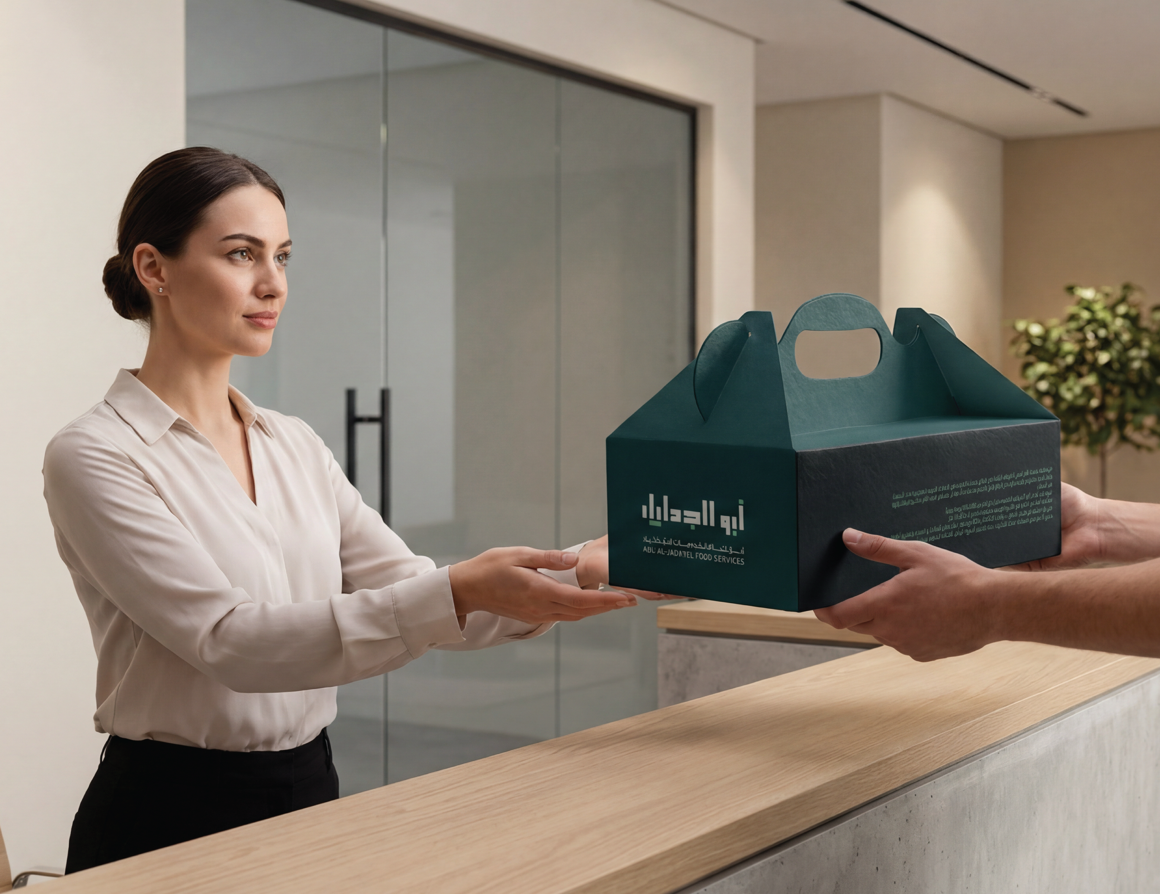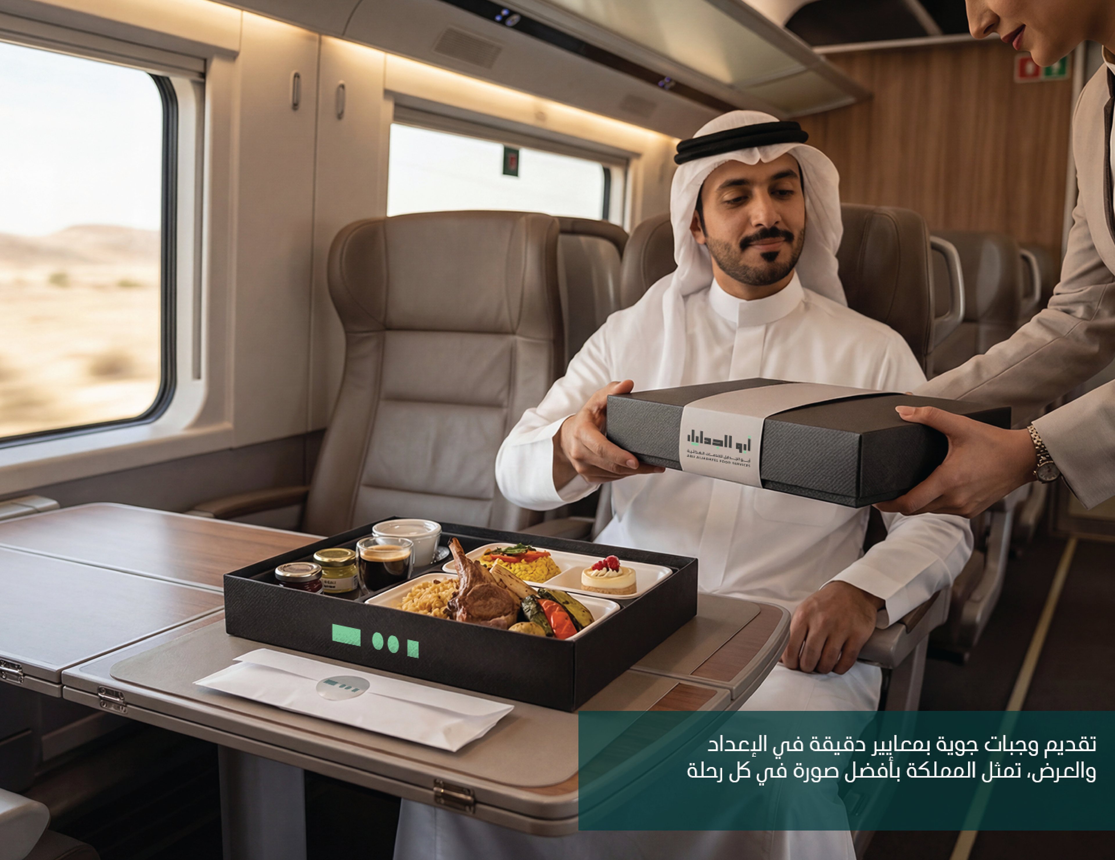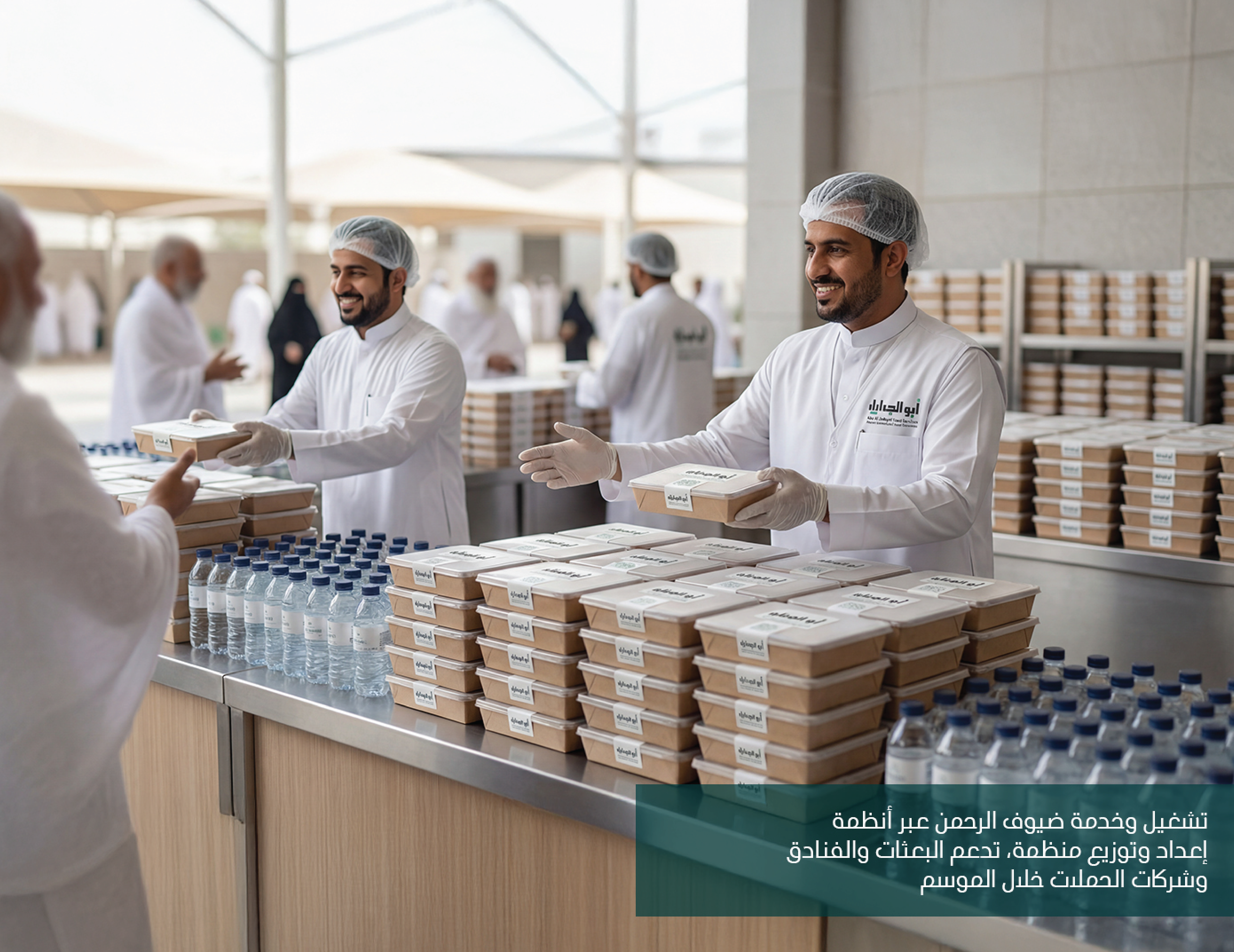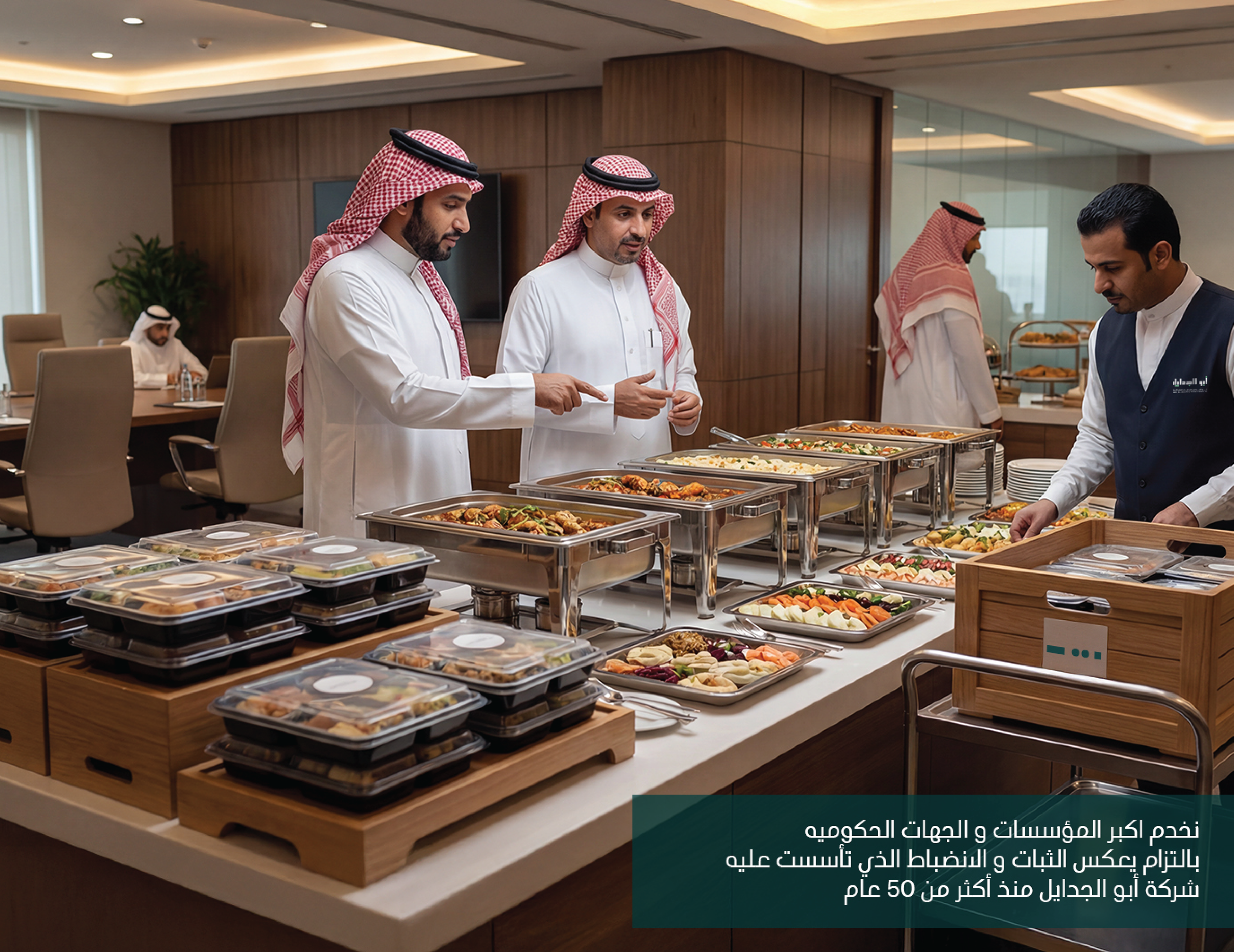 Abu AlJadayel Food Services brand identity system designed for premium large-scale catering operations. The project includes logo system, color palette, typography, geometric pattern language, and a full set of brand applications across stationery, uniforms, packaging, wayfinding, vehicle signage, and social media templates.