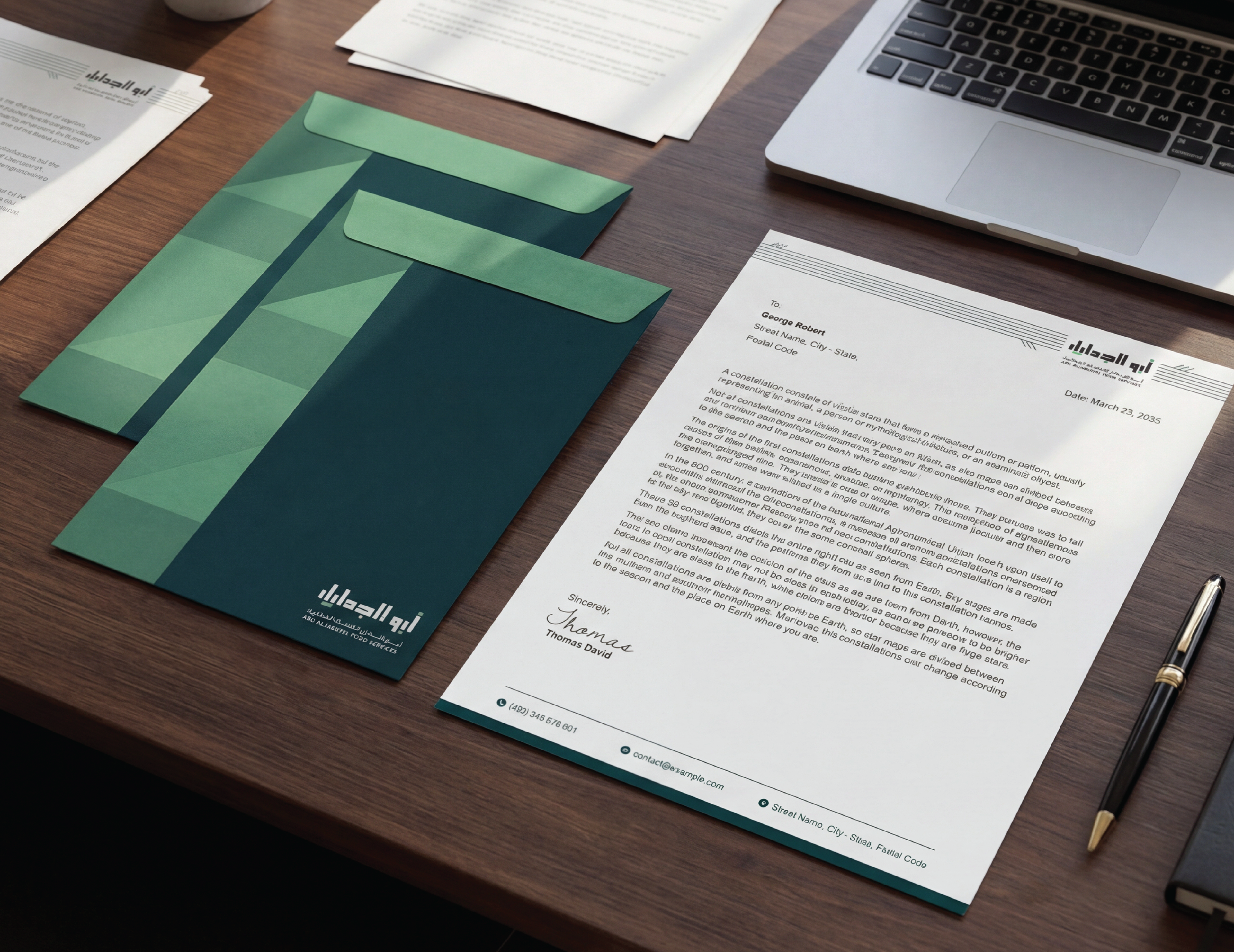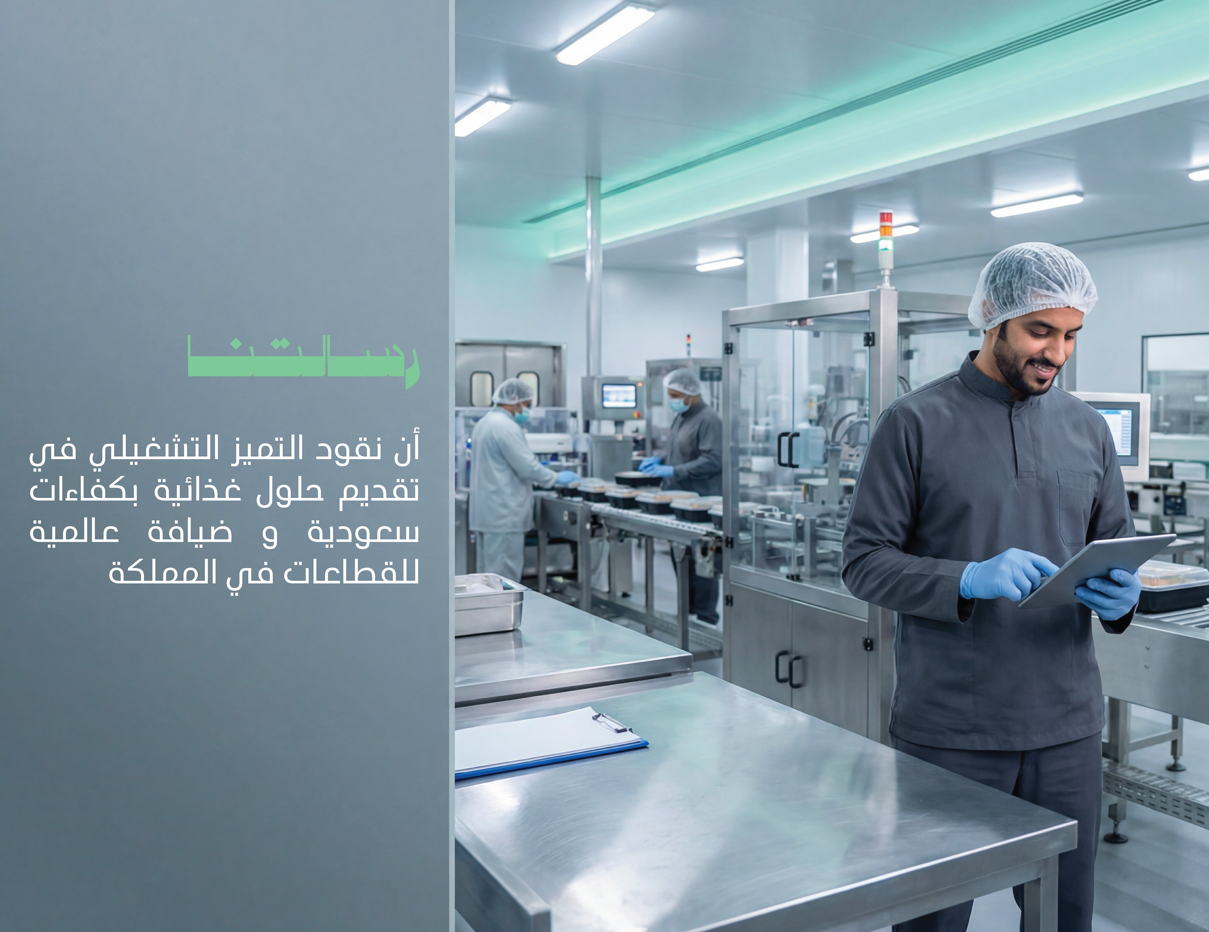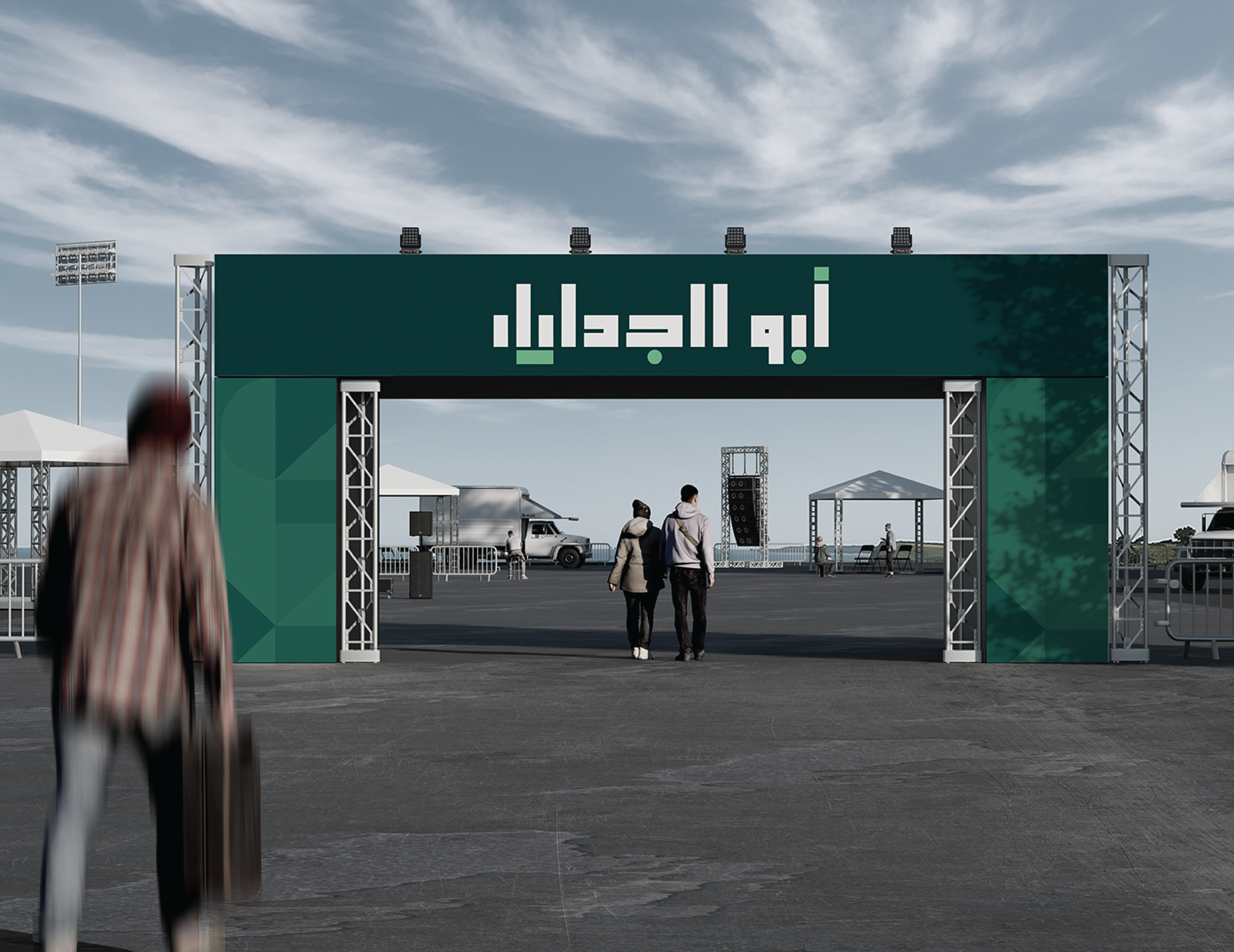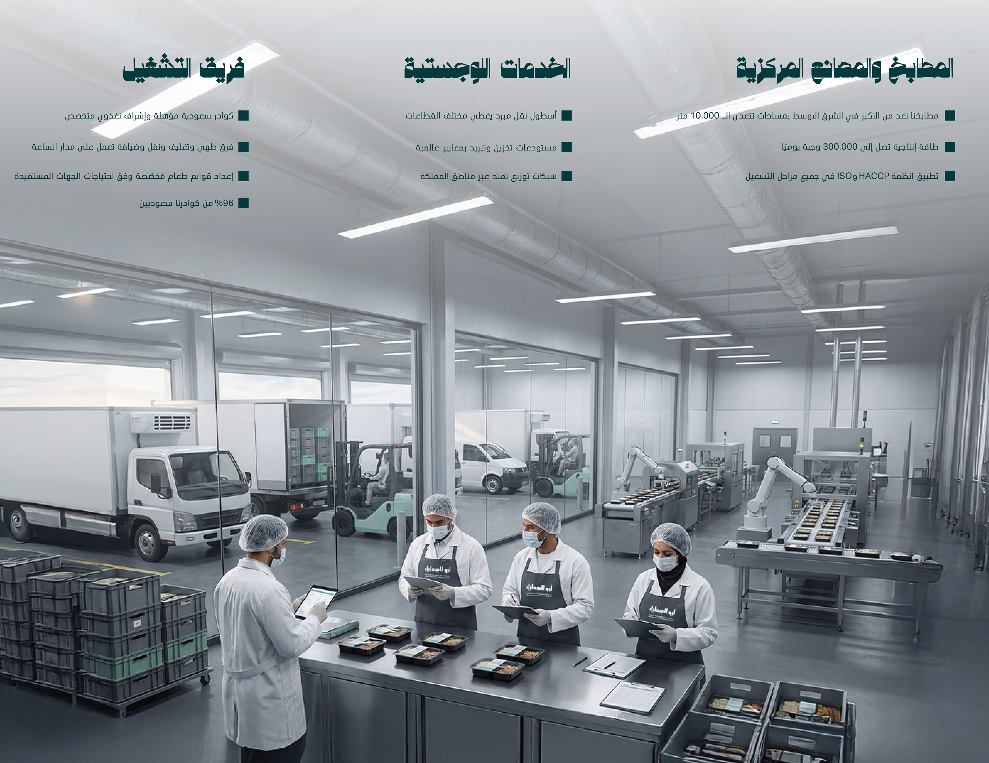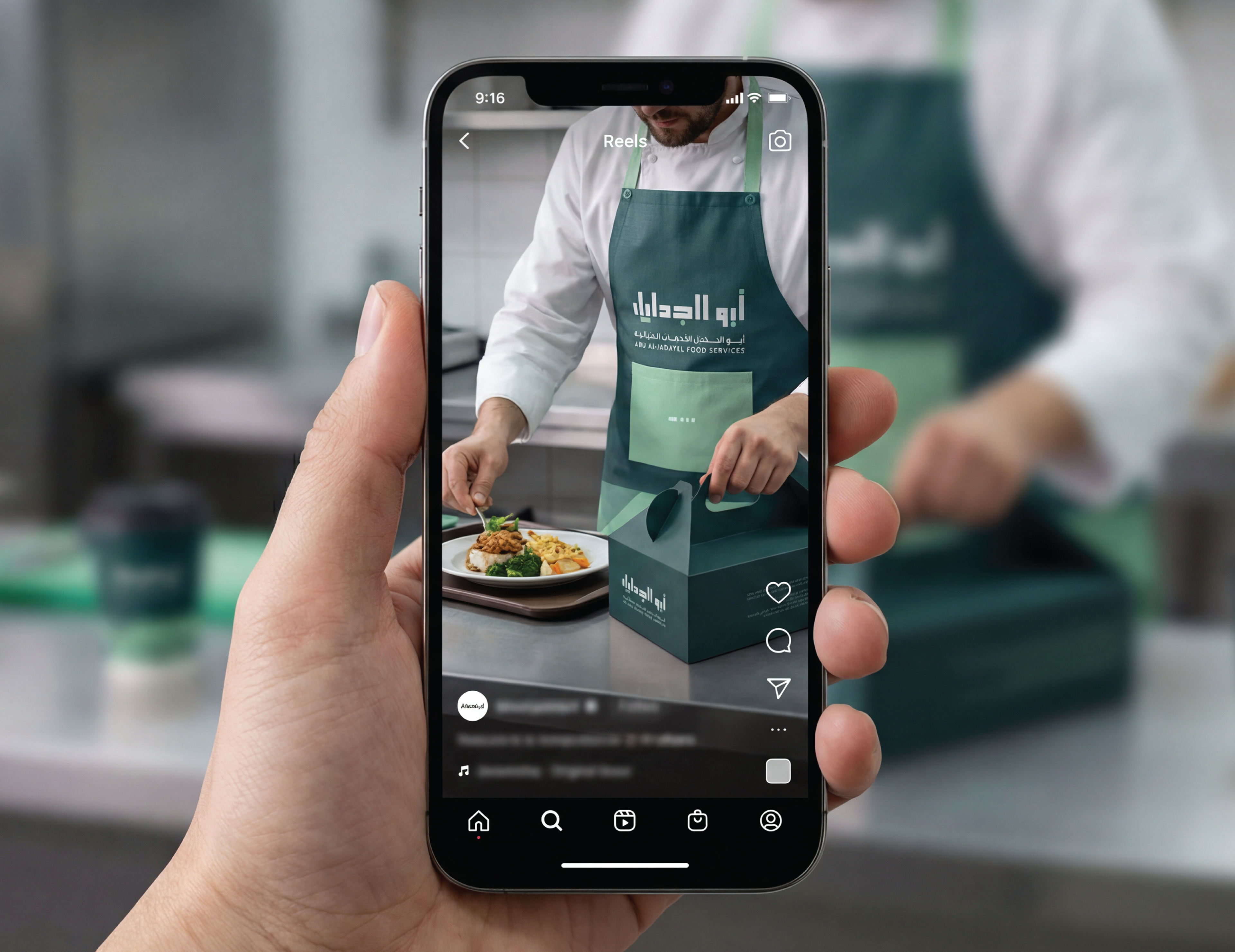 Abu AlJadayel Food Services brand identity system designed for premium large-scale catering operations. The project includes logo system, color palette, typography, geometric pattern language, and a full set of brand applications across stationery, uniforms, packaging, wayfinding, vehicle signage, and social media templates.