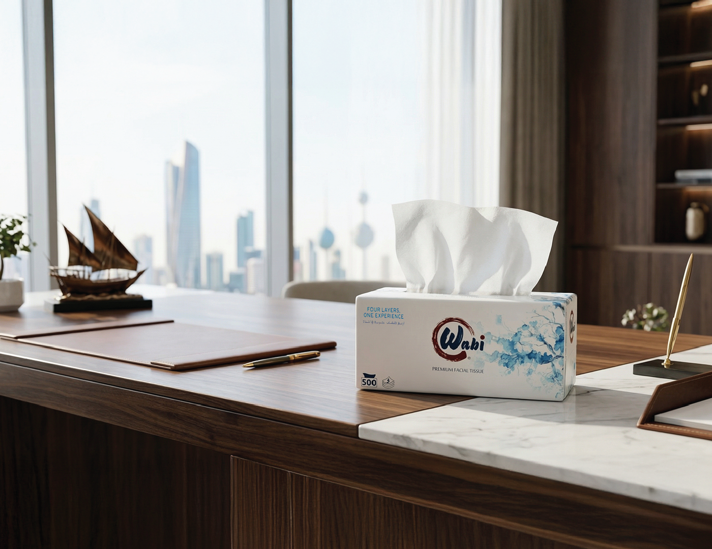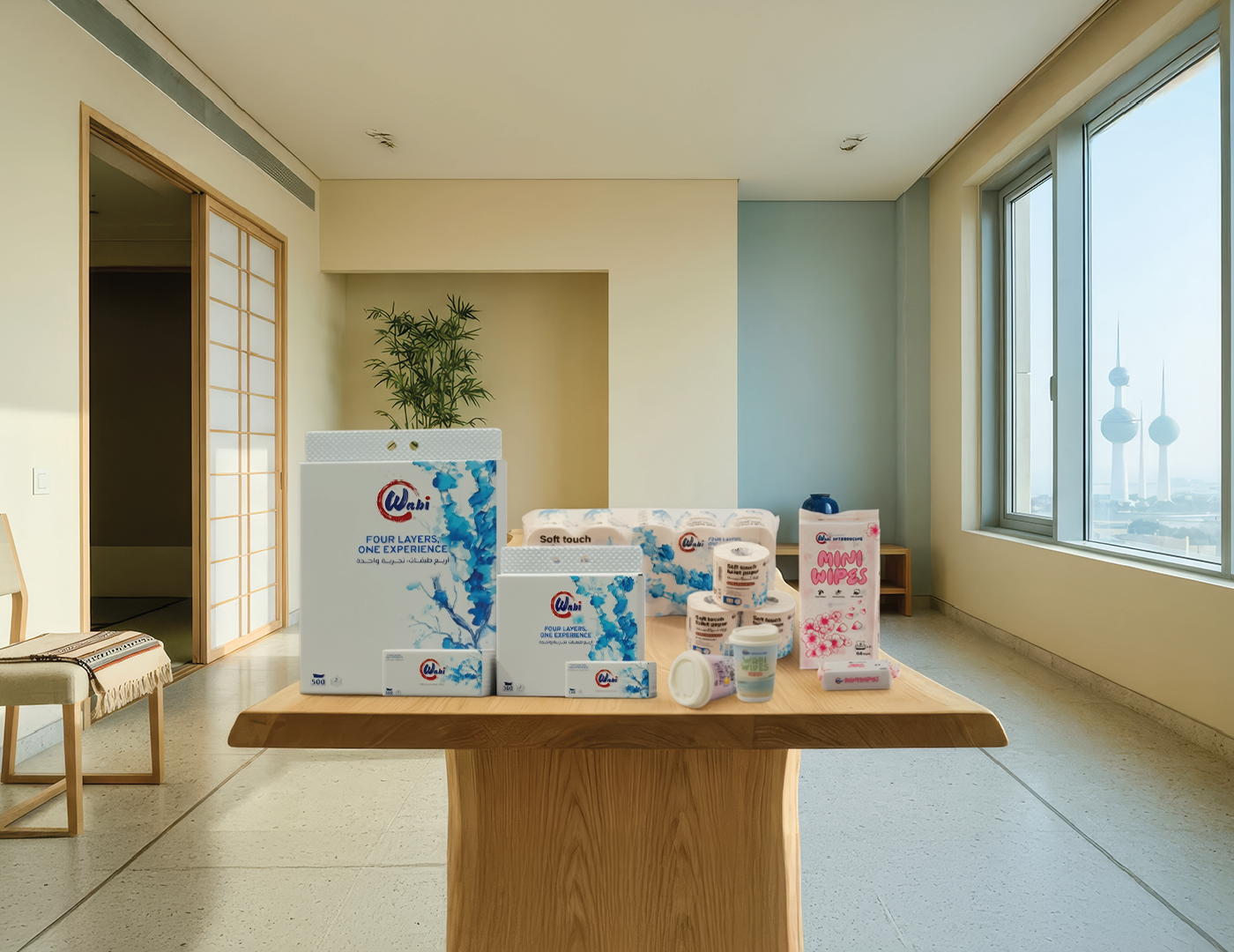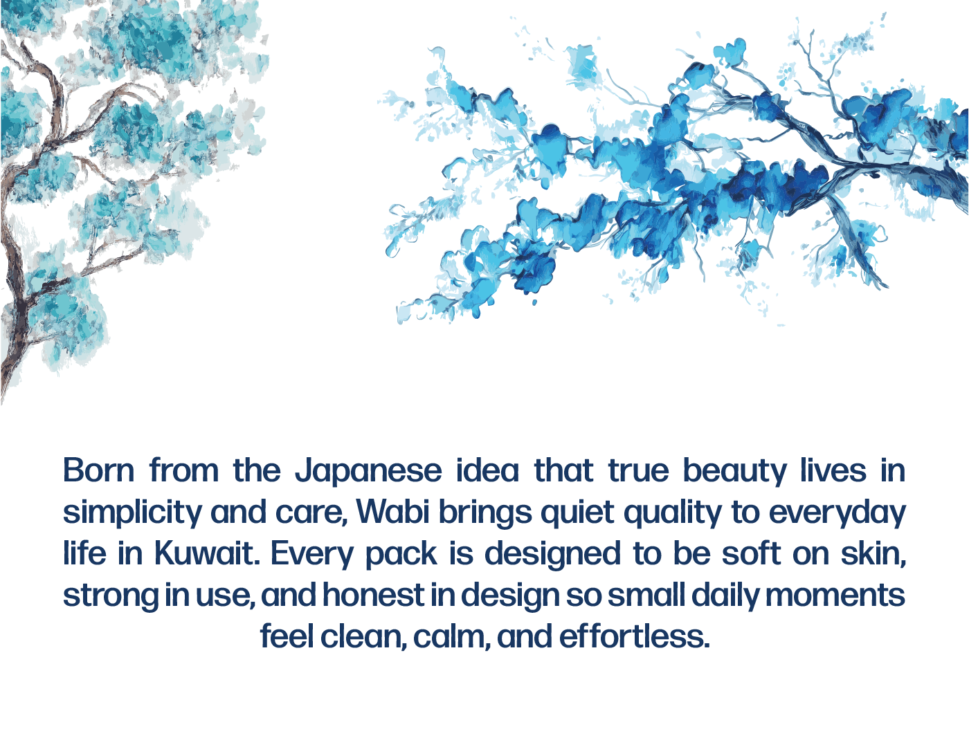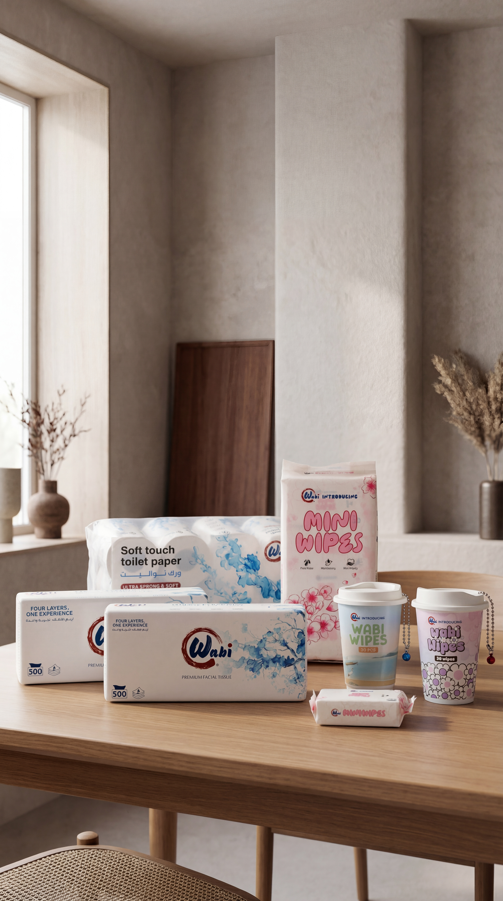 Wabi — Brand Overview Essence Quiet comfort for everyday life. Wabi blends the Japanese wabi-sabi philosophy—beauty in simplicity and honesty—with a modern Kuwaiti spirit. The result is premium paper products that feel calm, clean and considered. Purpose Make daily moments softer, safer, and simpler—at home, in the car, and on the go. Brand Promise Pure, soft and reliably strong tissues that respect skin, space, and nature. Positioning For households and modern lifestyles in Kuwait and the GCC who want premium hygiene products without fuss, Wabi delivers a four-layer experience of softness and strength, inspired by Japanese minimalism and designed for everyday life. Unlike scented or flimsy alternatives, Wabi products are unscented, skin-friendly, lint-free and strong when wet.