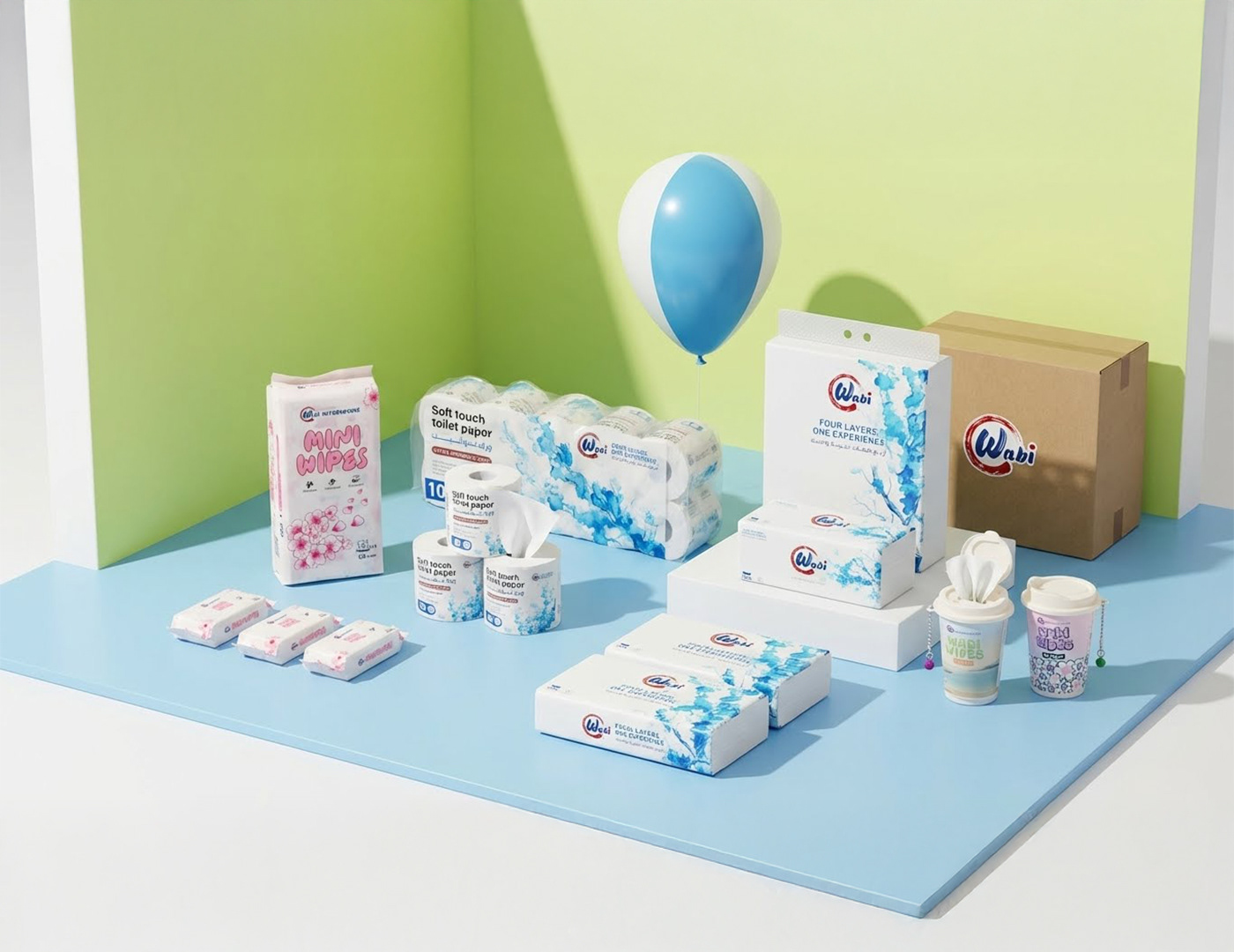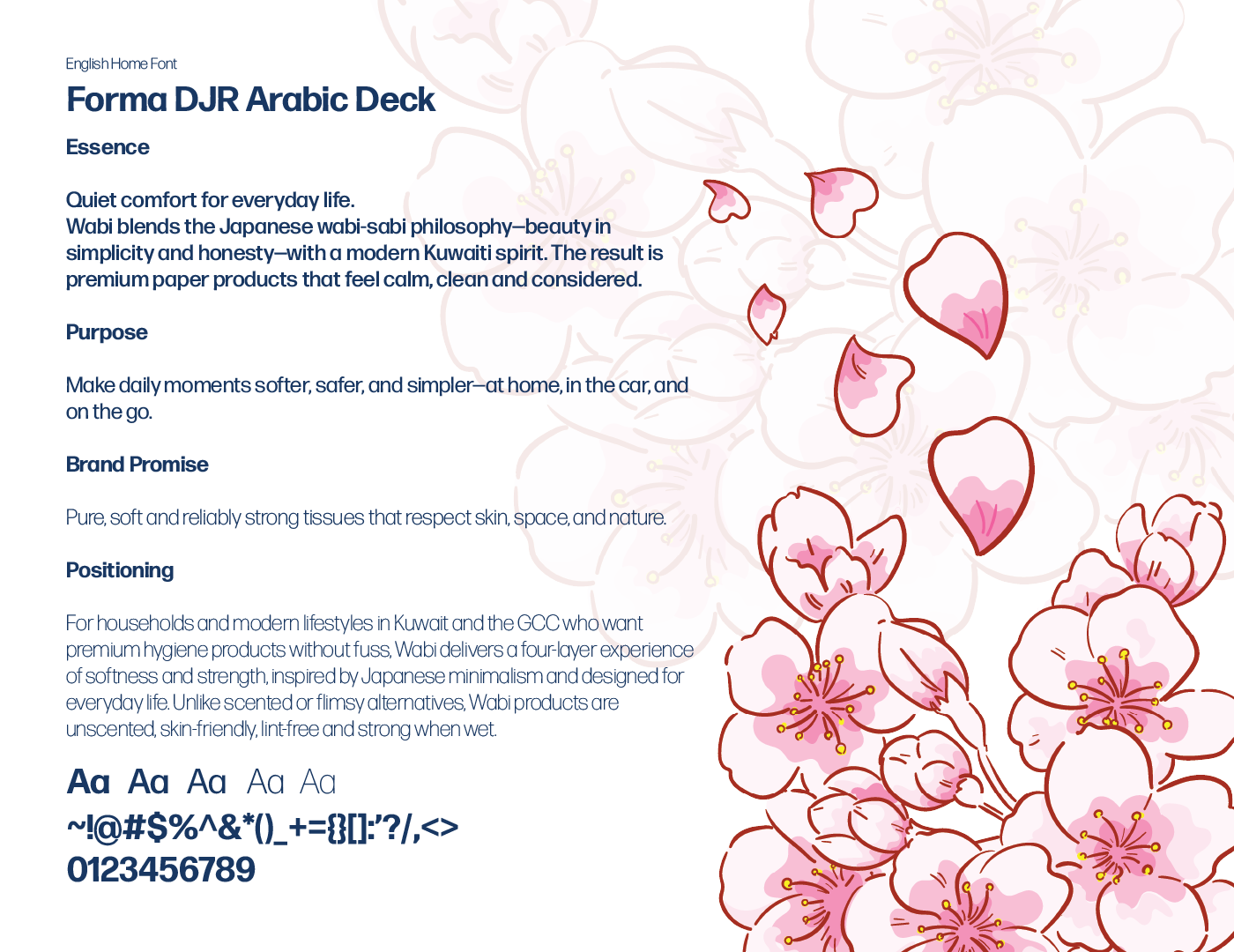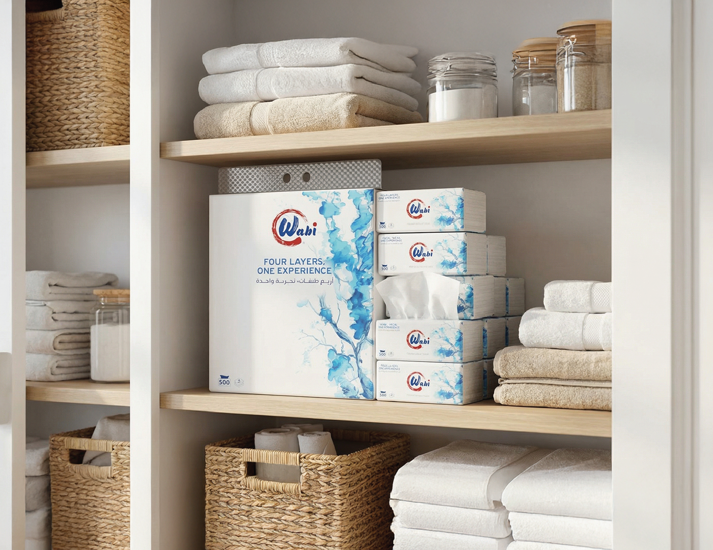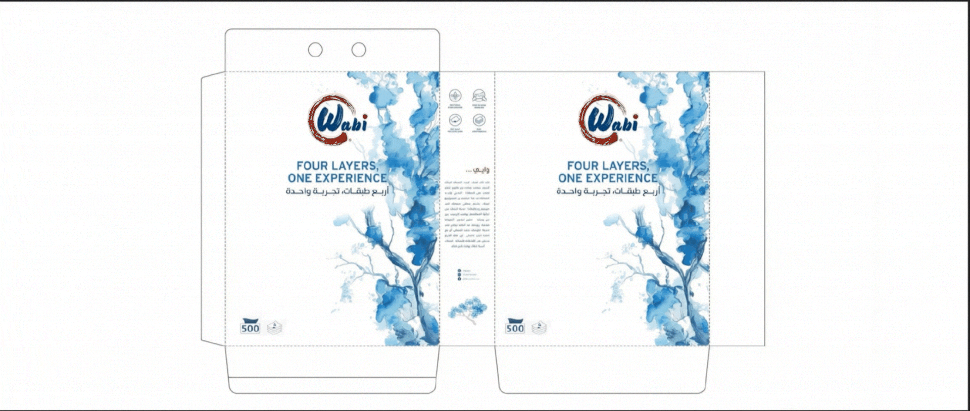 Wabi — Brand Overview Essence Quiet comfort for everyday life. Wabi blends the Japanese wabi-sabi philosophy—beauty in simplicity and honesty—with a modern Kuwaiti spirit. The result is premium paper products that feel calm, clean and considered. Purpose Make daily moments softer, safer, and simpler—at home, in the car, and on the go. Brand Promise Pure, soft and reliably strong tissues that respect skin, space, and nature. Positioning For households and modern lifestyles in Kuwait and the GCC who want premium hygiene products without fuss, Wabi delivers a four-layer experience of softness and strength, inspired by Japanese minimalism and designed for everyday life. Unlike scented or flimsy alternatives, Wabi products are unscented, skin-friendly, lint-free and strong when wet.
